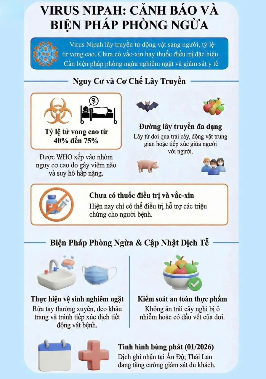 Vi rút Nipah (NiV) là vi rút nguy hiểm, gây bệnh nặng ở người với tỷ lệ tử vong cao, chủ yếu lây từ động vật sang người. Bệnh có thể lây qua tiếp xúc với dơi ăn quả, lợn hoặc người mắc bệnh, với triệu chứng từ sốt, đau đầu đến viêm não và tử vong. Hiện chưa có vắc-xin hay thuốc điều trị đặc hiệu, nên phòng bệnh là biện pháp quan trọng nhất. Cần ăn chín uống sôi, tránh thực phẩm từ động vật hoang dã, hạn chế tiếp xúc với động vật nguy cơ và giữ vệ sinh cá nhân. Khi có dấu hiệu nghi ngờ, cần đến cơ sở y tế kịp thời để bảo vệ bản thân và cộng đồng