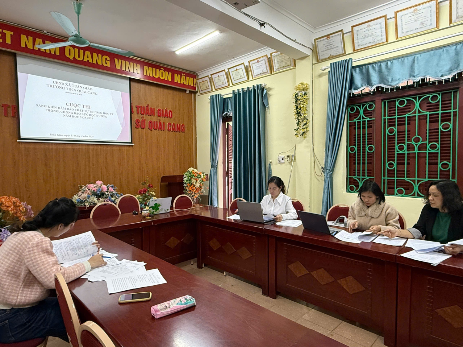 Hưởng ứng kế hoạch số 477/KH - UBND ngày 2 tháng 3 năm 2026 của UBND xã Tuần Giáo về tổ chức Cuộc thi “Sáng kiến bảo đảm trật tự trường học về phòng, chống bạo lực học đường” năm 2026, Trường THCS Quài Cang đã tích cực triển khai sâu rộng, tạo nên một đợt sinh hoạt giáo dục có ý nghĩa thiết thực, thu hút sự tham gia hưởng ứng của đông đảo học sinh trong toàn trường. Sau thời gian phát động sôi nổi, cuộc thi đã ghi nhận 45 bài dự thi – 45 góc nhìn, 45 tiếng nói thể hiện nhận thức, trách nhiệm và tình cảm của học sinh đối với vấn đề bạo lực học đường. Nhiều bài viết được đầu tư công phu, thể hiện suy nghĩ chân thành, lập luận chặt chẽ, không chỉ phản ánh thực trạng mà còn mạnh dạn đề xuất những giải pháp thiết thực, gần gũi với môi trường học đường. Hiện nay, nhà trường đang tổ chức chấm, đánh giá và lựa chọn các sản phẩm tiêu biểu tham gia vòng thi cấp xã. Công tác chấm thi được thực hiện nghiêm túc, khách quan, công bằng, bám sát các tiêu chí về nội dung, tính sáng tạo, tính thực tiễn và hình thức trình bày. Hình ảnh: Ban giám khảo chấm lựa chọn sản phẩm Kết quả, nhà trường dự kiến trao 01 giải Nhất, 03 giải Nhì, 05 giải Ba, 07 giải Khuyến khích, đồng thời lựa chọn 04 bài viết xuất sắc nhất (gồm các bài đạt giải Nhất, Nhì) tham gia dự thi cấp xã theo đúng quy định. Điểm nổi bật của cuộc thi năm nay là nhiều bài viết không dừng lại ở việc phản ánh hiện tượng mà đã thể hiện rõ sự trưởng thành trong nhận thức và hành động của học sinh. Các em đã biết nhìn nhận vấn đề một cách đa chiều, biết phân biệt đúng – sai, biết lên án cái xấu và lan tỏa điều tốt đẹp. Nhiều sáng kiến thiết thực đã được đề xuất như: xây dựng tình bạn đẹp, kỹ năng giải quyết mâu thuẫn từ sớm, thiết lập “kênh chia sẻ an toàn” trong nhà trường, hay ứng dụng công nghệ để cảnh báo và phòng ngừa bạo lực trên không gian mạng. Đây chính là những giải pháp giàu tính khả thi, xuất phát từ thực tiễn và mang đậm dấu ấn học sinh.