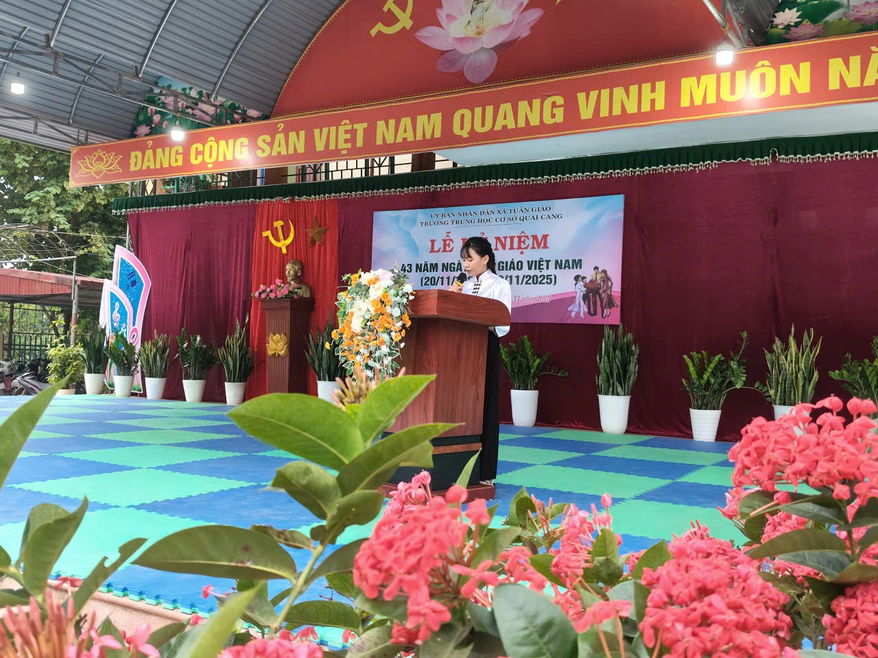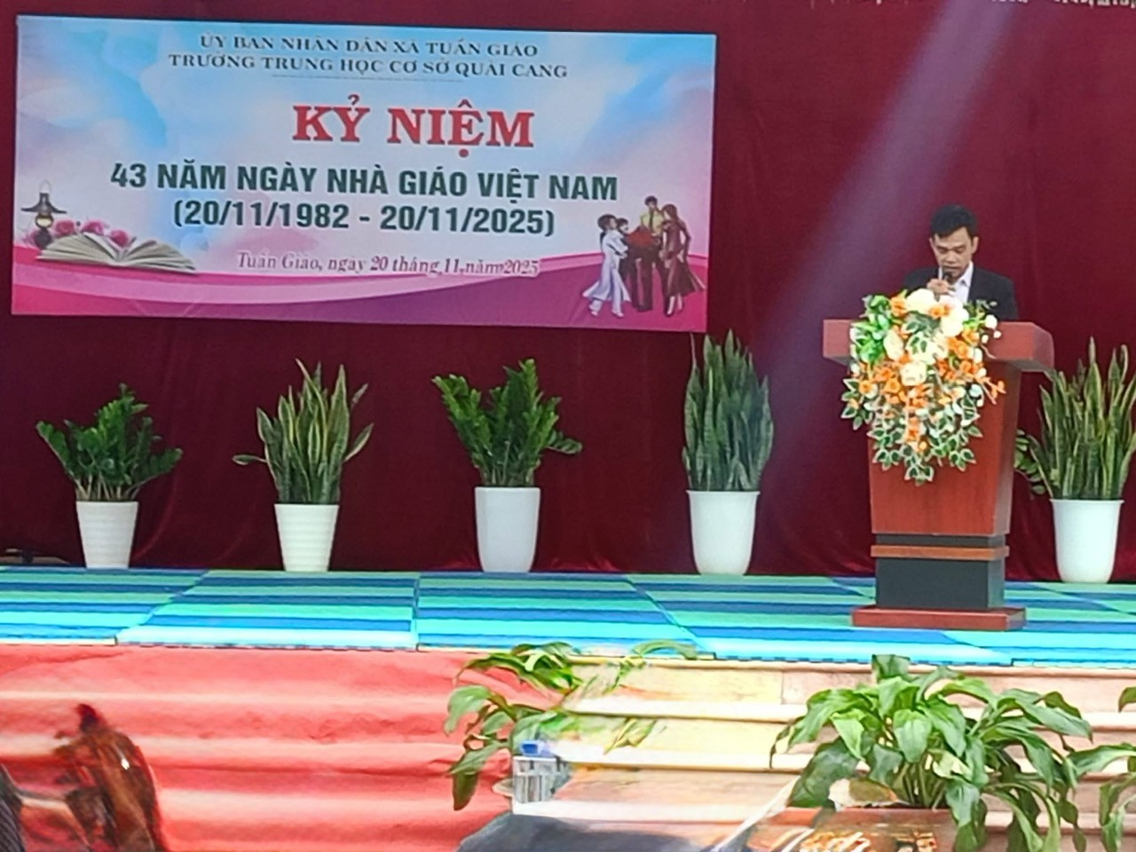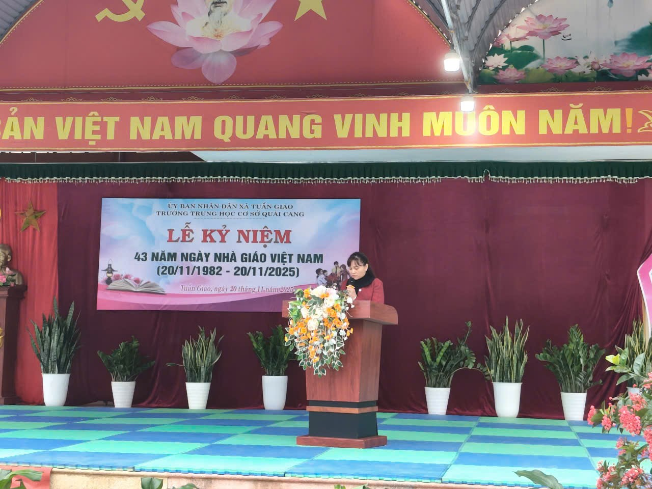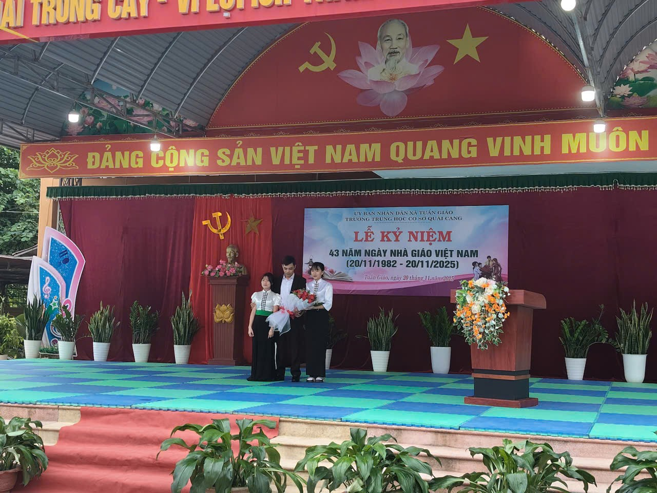 Tiết mục văn nghệ của học sinh trong buổi lễ Tiếp đó, Thầy Nguyễn Phú Tân – Bí thư Chi bộ, Hiệu trưởng nhà trường – trang trọng đọc diễn văn kỷ niệm, ôn lại truyền thống tôn sư trọng đạo của dân tộc và gửi lời tri ân chân thành đến đội ngũ cán bộ, giáo viên đã và đang cống hiến cho mái trường Quài Cang. Thầy xúc động chia sẻ: “Mỗi thành công của học sinh hôm nay đều được làm nên từ tâm huyết, sự tận tụy và tình yêu nghề của các thầy cô giáo.” Thầy giáo Nguyễn Phú Tân - Bí thư Chi bộ, Hiệu trưởng nhà trường đọc diễn văn kỷ nniệm Trong không khí thiêng liêng ấy, Bà Bạc Thị Phương phát biểu ghi nhận những nỗ lực vượt khó của thầy và trò, đồng thời đánh giá cao thành tích nổi bật của nhà trường trong năm học vừa qua. Bà Bạc Thị Phương– UV Ban Thường vụ, Chủ nhiệm UBKT Đảng ủy xã Tuần Giáo phát biểu và tặng hoa nhà trường Ngay sau lời phát biểu, Bà Phương đã thay mặt lãnh đạo địa phương trân trọng tặng Ban Giám hiệu bó hoa tươi thắm, như lời chúc mừng và lời cảm ơn sâu sắc gửi đến những người đang dìu dắt thế hệ trẻ của xã nhà. Khoảnh khắc ấy đã để lại nhiều cảm xúc đẹp, lan tỏa tinh thần biết ơn trong toàn buổi kỷ niệm. Hình ảnh đại diện học sinh tri ân thầy cô Buổi kỷ niệm tiếp tục với phần tuyên dương các thầy cô đạt thành tích xuất sắc và khen thưởng những học sinh tiêu biểu trong phong trào học tập, rèn luyện. Những bó hoa, những ánh mắt tự hào và lời chúc mộc mạc của học trò đã làm ấm lòng thầy cô trong ngày đặc biệt này. Hình ảnh học sinh nhận phần thưởng trong phong trào thi đua đợt I Nhà trường cũng dành những tình cảm trân trọng gửi đến các thầy cô giáo đã nghỉ hưu – những người đặt nền móng vững chắc cho hành trình phát triển của Trường THCS Quài Cang hôm nay. Tiết mục văn nghệ của học sinh trong buổi lễ Kỷ niệm 43 năm Ngày Nhà giáo Việt Nam khép lại trong niềm vui, niềm tự hào và sự xúc động khó quên. Ngày 20/11 trở thành nguồn động lực để thầy và trò tiếp tục đoàn kết, đổi mới, sáng tạo, cùng nhau viết tiếp những trang thành tích mới trong năm học 2025–2026.
