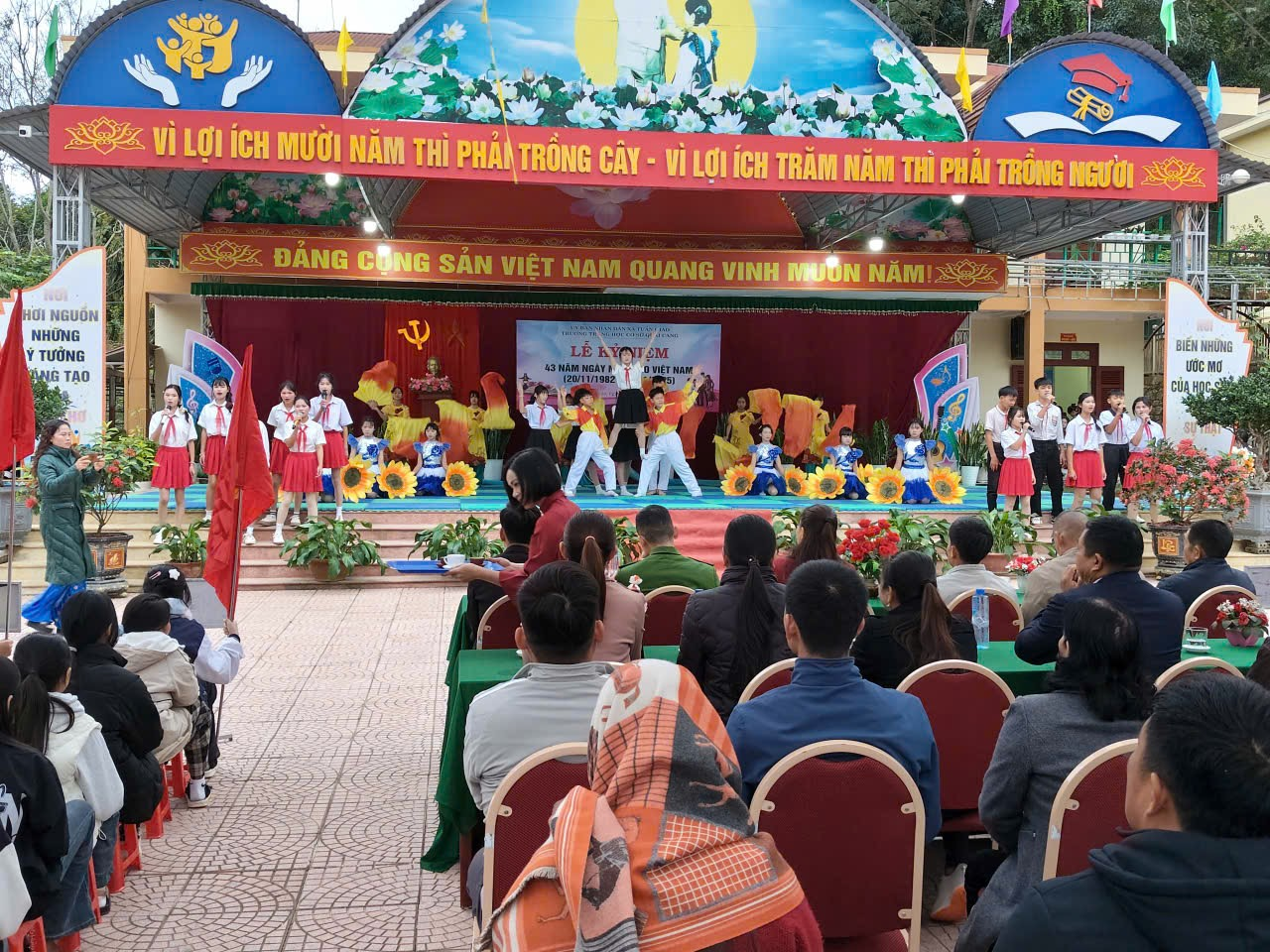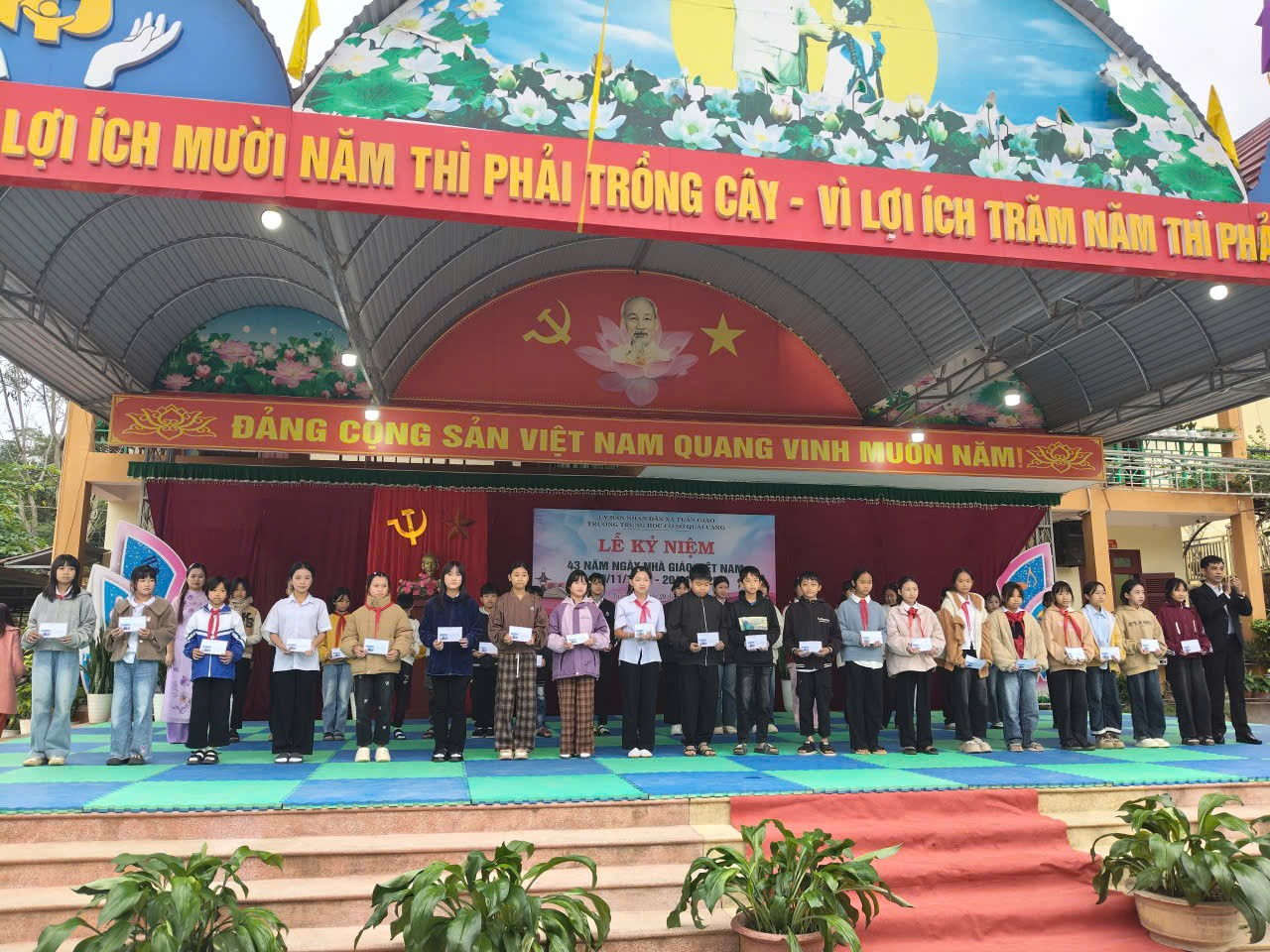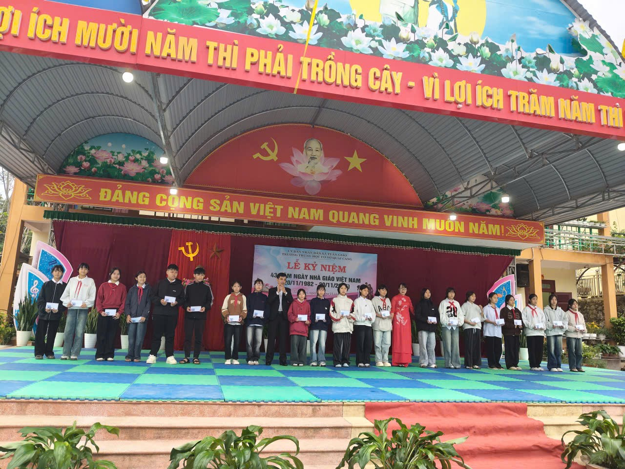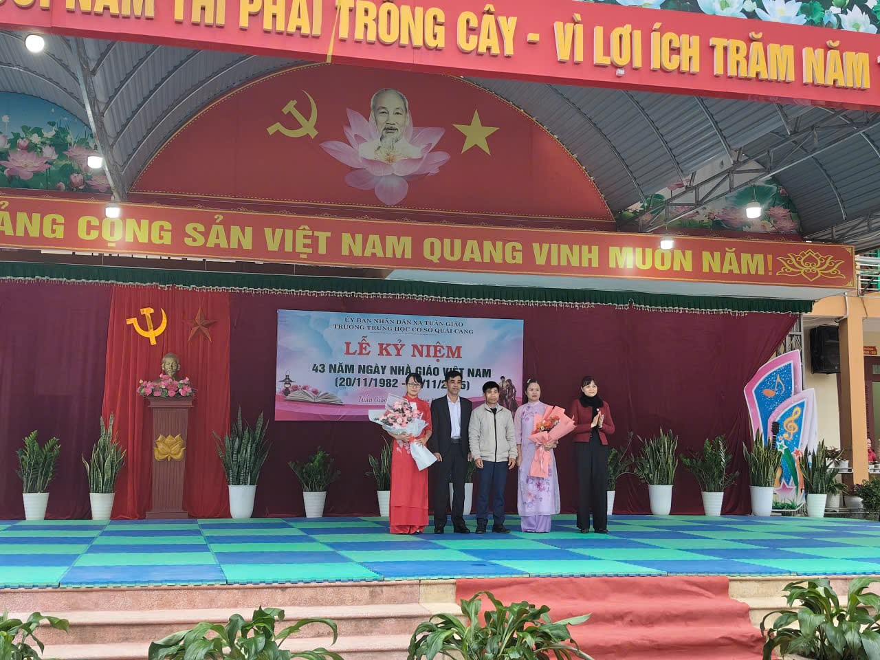 Tiết mục văn nghệ của học sinh trong buổi lễ Tiếp đó, Thầy Nguyễn Phú Tân – Bí thư Chi bộ, Hiệu trưởng nhà trường – trang trọng đọc diễn văn kỷ niệm, ôn lại truyền thống tôn sư trọng đạo của dân tộc và gửi lời tri ân chân thành đến đội ngũ cán bộ, giáo viên đã và đang cống hiến cho mái trường Quài Cang. Thầy xúc động chia sẻ: “Mỗi thành công của học sinh hôm nay đều được làm nên từ tâm huyết, sự tận tụy và tình yêu nghề của các thầy cô giáo.” Thầy giáo Nguyễn Phú Tân - Bí thư Chi bộ, Hiệu trưởng nhà trường đọc diễn văn kỷ nniệm Trong không khí thiêng liêng ấy, Bà Bạc Thị Phương phát biểu ghi nhận những nỗ lực vượt khó của thầy và trò, đồng thời đánh giá cao thành tích nổi bật của nhà trường trong năm học vừa qua. Bà Bạc Thị Phương– UV Ban Thường vụ, Chủ nhiệm UBKT Đảng ủy xã Tuần Giáo phát biểu và tặng hoa nhà trường Ngay sau lời phát biểu, Bà Phương đã thay mặt lãnh đạo địa phương trân trọng tặng Ban Giám hiệu bó hoa tươi thắm, như lời chúc mừng và lời cảm ơn sâu sắc gửi đến những người đang dìu dắt thế hệ trẻ của xã nhà. Khoảnh khắc ấy đã để lại nhiều cảm xúc đẹp, lan tỏa tinh thần biết ơn trong toàn buổi kỷ niệm. Hình ảnh đại diện học sinh tri ân thầy cô Buổi kỷ niệm tiếp tục với phần tuyên dương các thầy cô đạt thành tích xuất sắc và khen thưởng những học sinh tiêu biểu trong phong trào học tập, rèn luyện. Những bó hoa, những ánh mắt tự hào và lời chúc mộc mạc của học trò đã làm ấm lòng thầy cô trong ngày đặc biệt này. Hình ảnh học sinh nhận phần thưởng trong phong trào thi đua đợt I Nhà trường cũng dành những tình cảm trân trọng gửi đến các thầy cô giáo đã nghỉ hưu – những người đặt nền móng vững chắc cho hành trình phát triển của Trường THCS Quài Cang hôm nay. Tiết mục văn nghệ của học sinh trong buổi lễ Kỷ niệm 43 năm Ngày Nhà giáo Việt Nam khép lại trong niềm vui, niềm tự hào và sự xúc động khó quên. Ngày 20/11 trở thành nguồn động lực để thầy và trò tiếp tục đoàn kết, đổi mới, sáng tạo, cùng nhau viết tiếp những trang thành tích mới trong năm học 2025–2026.