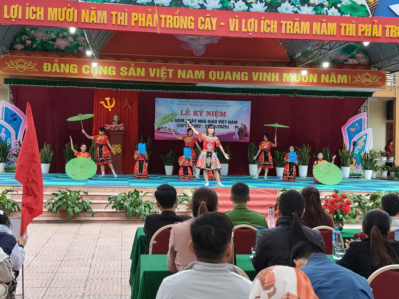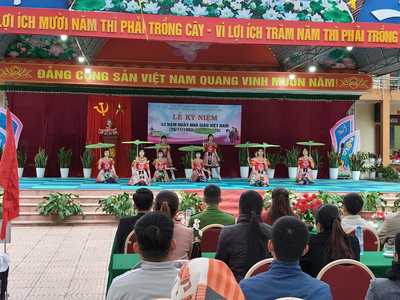 Sáng ngày 20/11, trong không khí rộn ràng tri ân trên khắp mọi miền Tổ quốc, Trường THCS Quài Cang đã long trọng tổ chức kỷ niệm 43 năm Ngày Nhà giáo Việt Nam 20/11. Buổi mít tinh diễn ra trong không gian trang trọng, ấm áp và chan chứa tình cảm biết ơn sâu sắc của học sinh, phụ huynh và toàn thể cộng đồng dành cho những người làm nghề gieo chữ. Hình ảnh thầy cô chụp ảnh lưu niệm cùng đại biểu Nhà trường vinh dự đón tiếp: Bà Bạc Thị Phương – Ủy viên Ban Thường vụ, Chủ nhiệm UBKT Đảng ủy xã Tuần Giáo; Ông Nguyễn Hữu Trung – Thiếu tá, Phó Trưởng Công an xã Tuần Giáo; Ông Vũ Đức Việt – Phó Giám đốc Ngân hàng Agribank Tuần Giáo; các chuyên viên UBKT Đảng ủy; đại diện Phòng Văn hóa – Xã hội; Hội Cựu giáo chức xã Tuần Giáo; Trưởng bản; Ban đại diện cha mẹ học sinh và đại diện Chi hội phụ huynh 16 lớp; cùng các cán bộ, viên chức nhà trường đã nghỉ hưu; Các thầy cô giáo và học sinh có mặt đông đủ. Sự hiện diện của quý đại biểu không chỉ mang lại niềm vinh dự mà còn thể hiện sự quan tâm sâu sắc của địa phương đối với sự nghiệp giáo dục của nhà trường. Hình ảnh tại buổi lễ Ngay từ sáng sớm, khuôn viên trường đã rực rỡ sắc hoa. Những ánh mắt học sinh háo hức, những tấm thiệp nhỏ xinh và lời chúc mộc mạc đã tạo nên bầu không khí thật ấm áp và xúc động. Mở đầu chương trình là các tiết mục văn nghệ tươi trẻ, gửi gắm lời tri ân của học trò đến thầy cô – những người thắp lên ngọn lửa tri thức và nuôi dưỡng ước mơ cho bao thế hệ.