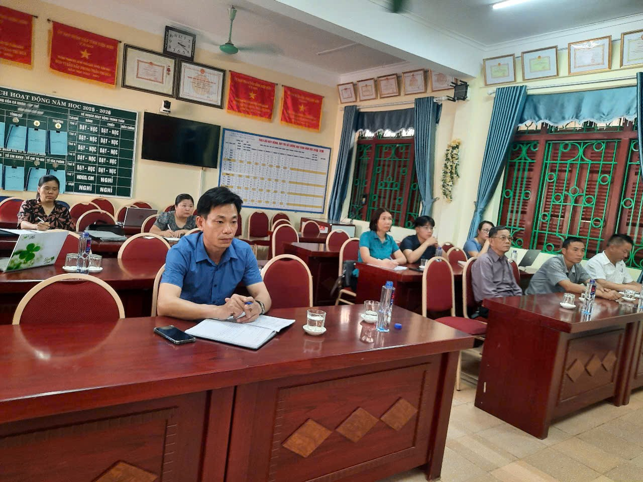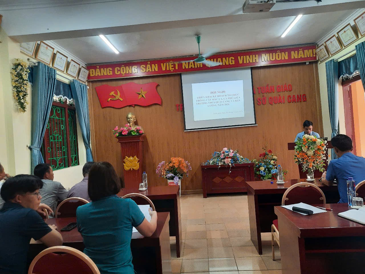 Chiều ngày 02/4/2026, tại Trường THCS Quài Cang xã Tuần Giáo, đã diễn ra Hội nghị triển khai kế hoạch phối hợp tổ chức trồng cây mắc ca, cà phê giữa nhà trường và bản Cuông. Hoạt động nhằm cụ thể hóa Kế hoạch số 752/KH-UBND ngày 27 tháng 3 năm 2026 của UBND xã Tuần Giáo về tổ chức trồng cây mắc ca, cà phê năm 2026 trên địa bàn xã Tuần Giáo, nhằmphát triển cây trồng chủ lực, góp phần thúc đẩy phát triển kinh tế nông nghiệp trên địa bàn. Đúng 15 giờ cùng ngày, tại Văn phòng nhà trường, các đồng chí trong Ban Giám hiệu, tổ trưởng đại diện các tổ chuyên môn, tổ văn phòng, Bí thư Chi đoàn, Tổng phụ trách Đội đã có mặt để hội ý với các đồng chí Bí thư Chi bộ, Trưởng bản, đại diện Ban Công tác Mặt trận và Đoàn Thanh niên bản Cuông. Hội nghị tập trung trao đổi, thống nhất phương án phối hợp triển khai thực hiện kế hoạch, đảm bảo phù hợp với điều kiện thực tế. Tại hội nghị, các nội dung trọng tâm của kế hoạch đã được triển khai, nhấn mạnh mục tiêu phát huy tinh thần đoàn kết, huy động sự tham gia của cán bộ, giáo viên và nhân dân trong việc trồng, chăm sóc cây mắc ca, cà phê – những cây trồng có giá trị kinh tế, phù hợp với điều kiện tự nhiên của địa phương. Hai bên đã thống nhất các nhiệm vụ trọng tâm như: Đẩy mạnh công tác tuyên truyền; huy động lực lượng tham gia hỗ trợ ngày công lao động; hướng dẫn kỹ thuật trồng, chăm sóc cây; tổ chức thực hiện đảm bảo tiến độ, chất lượng. Đặc biệt, việc hỗ trợ các hộ gia đình khó khăn, hộ thiếu lao động được xác định là nhiệm vụ ưu tiên trong quá trình triển khai. Phát biểu tại hội nghị, thầy giáo Nguyễn Phú Tân (Bí thư chi bộ, Hiệu trưởng) đại diện Ban Giám hiệu Trường THCS Quài Cang nhấn mạnh: “Nhà trường xác định rõ trách nhiệm đồng hành cùng địa phương trong các hoạt động phát triển kinh tế - xã hội. Việc tham gia hỗ trợ trồng cây mắc ca, cà phê không chỉ góp phần nâng cao đời sống nhân dân mà còn là cơ hội giáo dục học sinh về ý thức lao động, tinh thần trách nhiệm và tình yêu quê hương.” Thầy giáo Nguyễn Phú Tân - Bí thư chi bộ, Hiệu trưởng nhà trường phát biểu trong hội nghị