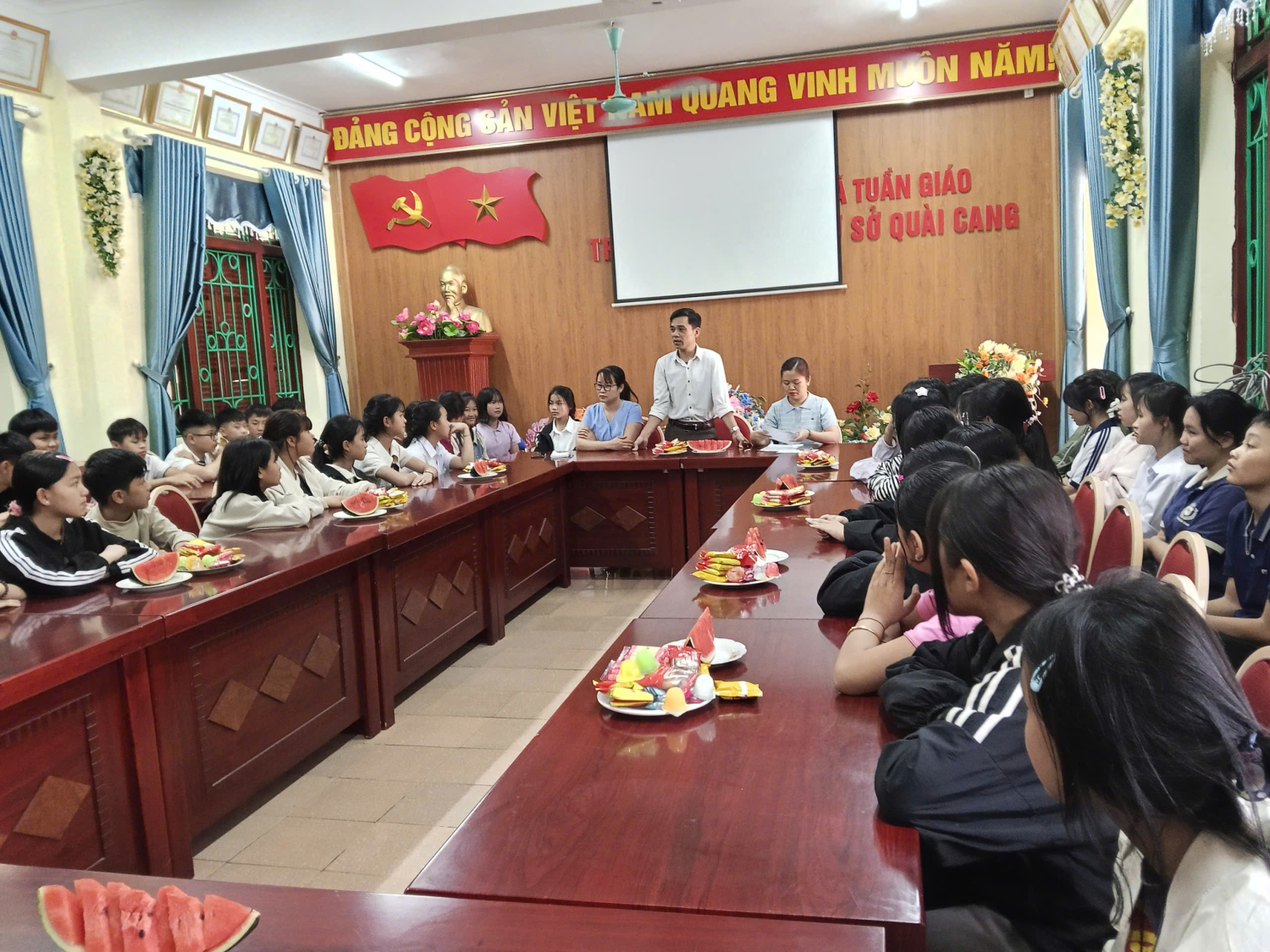 Nhằm động viên tinh thần và tiếp thêm động lực cho các em học sinh trước khi tham gia kỳ giao lưu học sinh giỏi, ngày 20 tháng 3 năm 2026 trường THCS Quài Cang đã tổ chức buổi gặp mặt các em học sinh tiêu biểu đại diện cho các khối 6, 7, 8 tham gia thi giao lưu các môn Ngữ văn, Toán và Tiếng Anh cấp xã. Hình ảnh: Thầy giáo Nguyễn Phú Tân - Hiệu trưởng phát biểu tại buổi gặp mặt