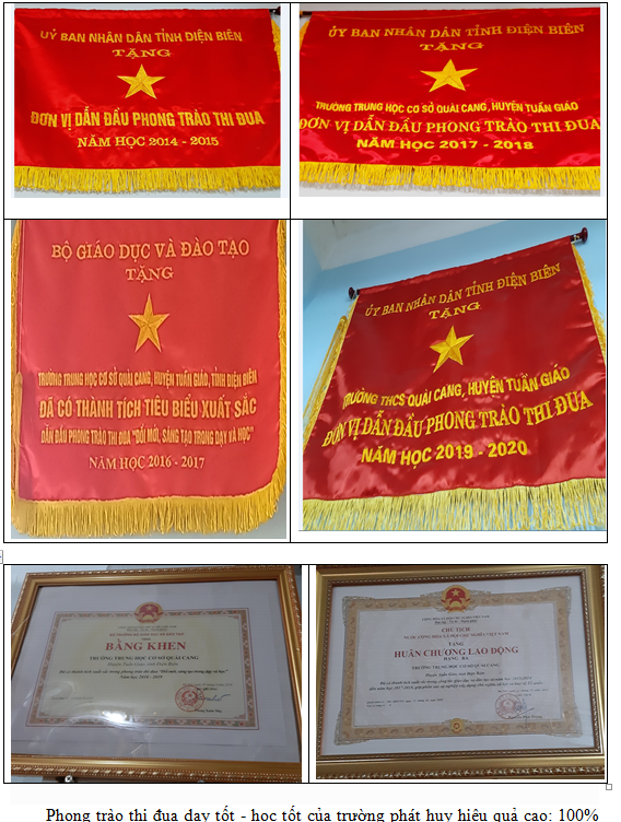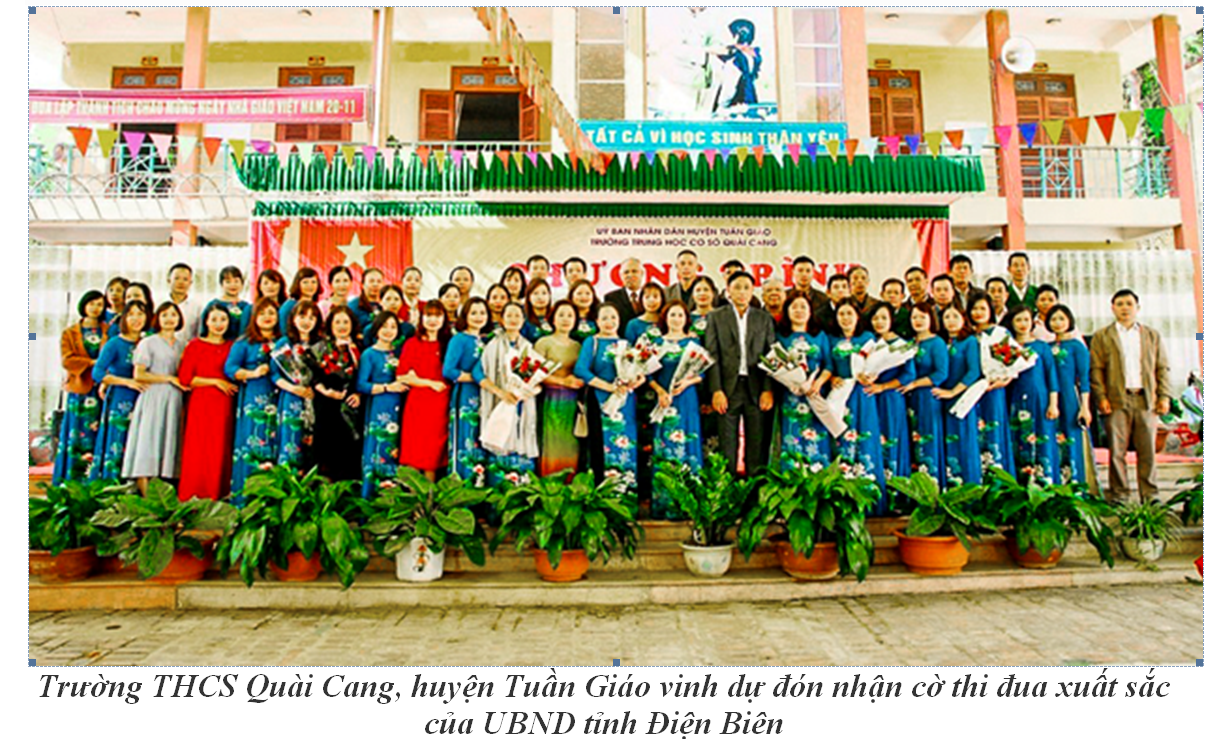 Trường luôn thực hiện tốt các cuộc vận động lớn của Đảng và của ngành như: “Học tập và làm theo tư tưởng, đạo đức, phong cách Hồ Chí Minh”, cuộc vận động “Mỗi thầy cô giáo là tấm gương đạo đức, tự học và sáng tạo”... Nâng cao hiệu quả phong trào thi đua do ngành phát động “Xây dựng trường học thân thiện, học sinh tích cực”. Phát động và thực hiện tốt các hoạt động phong trào của Đội TNTP Hồ Chí Minh theo chủ đề trong năm: Phong trào đôi bạn cùng tiến, phong trào đền ơn đáp nghĩa, uống nước nhớ nguồn, phong trào rèn kỹ năng sống cho học sinh. Để đạt được những thành tích, danh hiệu đó, nhà trường luôn làm tốt công tác tham mưu với cấp ủy Đảng, chính quyền địa phương, các tổ chức đoàn thể đóng trên địa bàn, phối kết hợp tốt với Ban đại diện cha mẹ học sinh đã huy động triệt để học sinh hoàn thành chương trình tiểu học vào học lớp 6 và học sinh trong độ tuổi ra lớp; duy trì tốt tỷ lệ học sinh chuyên cần, góp phần nâng cao chất lượng giáo dục và tiêu chí phổ cập giáo dục THCS. Bằng sự lao động, sáng tạo và cống hiến không ngừng của thầy và trò nhà trường, trong những năm qua nhà trường luôn đạt được những thành công mới. Đó là niềm vinh dự, niềm tự hào của các thế hệ nhà giáo và học sinh đã, đang công tác, cống hiến và học tập dưới mái trường THCS Quài Cang. Kết quả đó đã khẳng định chất lượng, sự phát triển bền vững để trường THCS Quài Cang luôn xứng đáng là niềm tự hào của ngành Giáo dục huyện Tuần Giáo./.